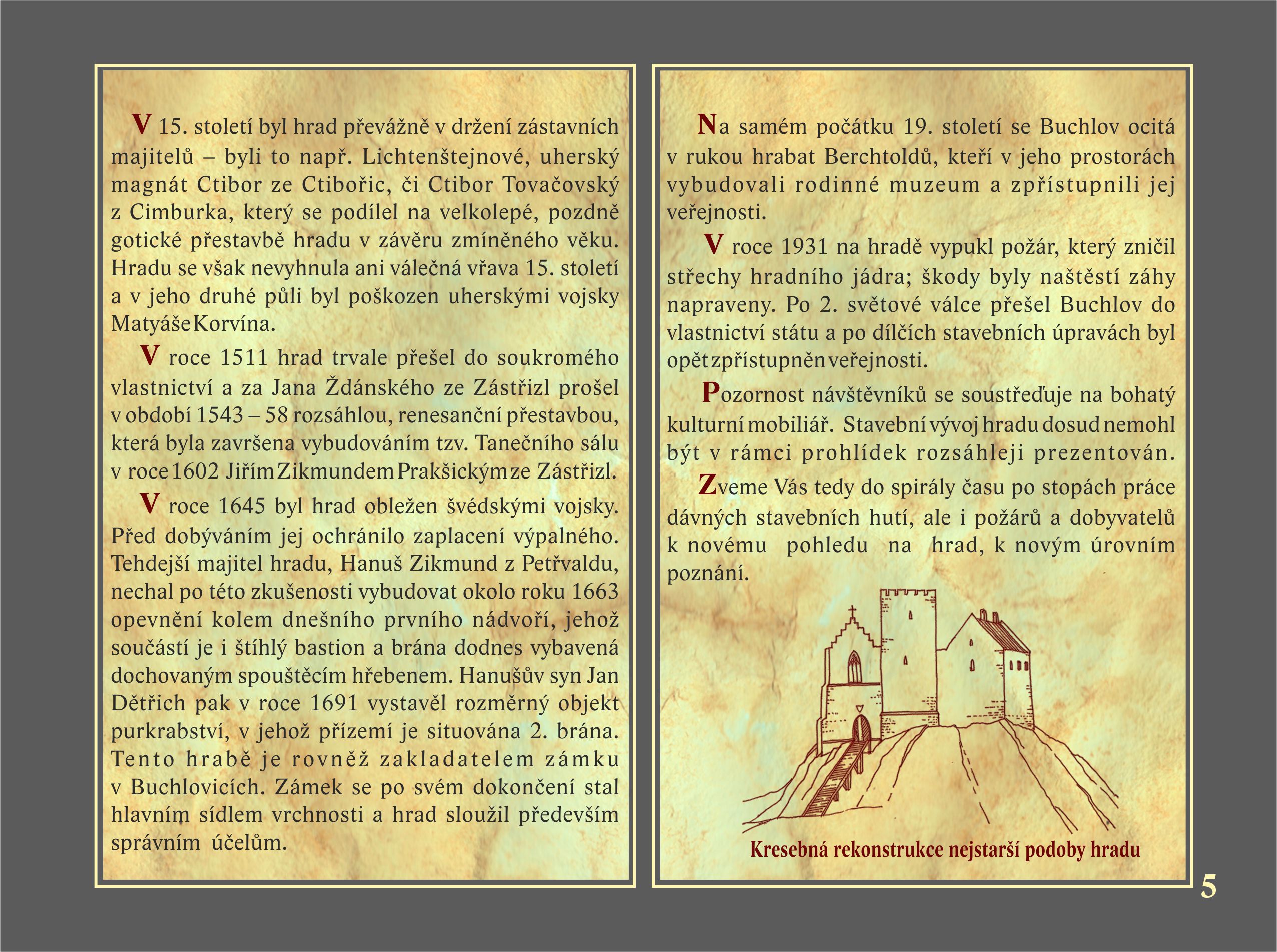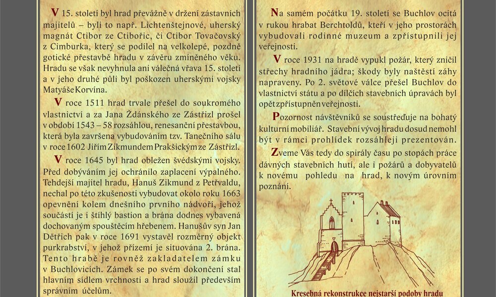 A special tour focused on development of the castle with its center of gravity in the Middle Ages. Limited number of people. Intended for those interested in the knowledge of medieval architecture and history of historic buildings. The price includes the publication "Buchlov Spiral - Building Development of Buchlov Castle in Pictures". The guide is a professional curator of the National Heritage Institut. The route is suitable for children from 12 years.